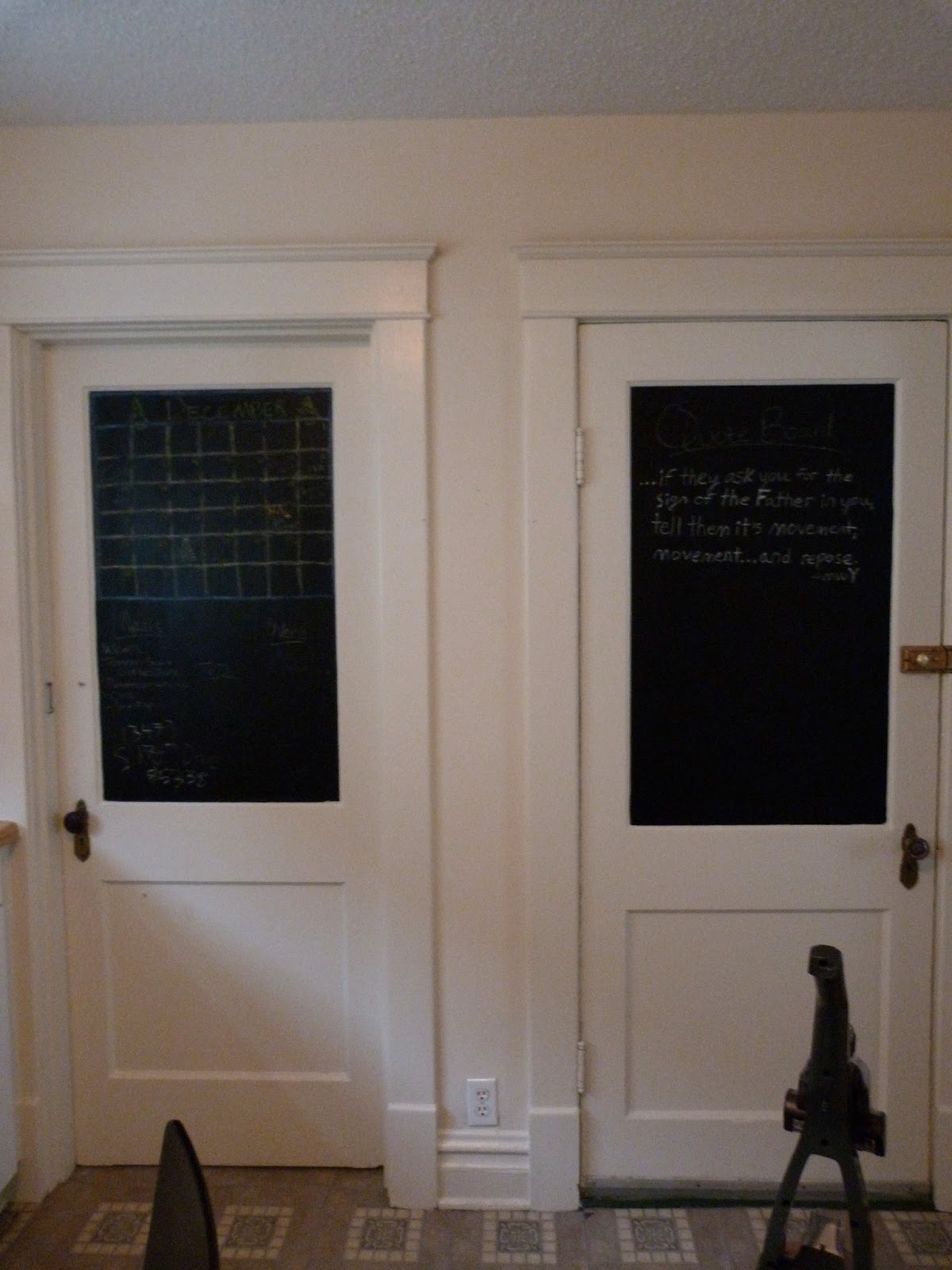 Kristin simply added campaign style hardware to her existing cabinets and, voila. Isn't it beautiful? Of course, she also added the chalkboard wall, painted her top cabinets, and added that thrift-store-bowl-turned-pendant-light.
